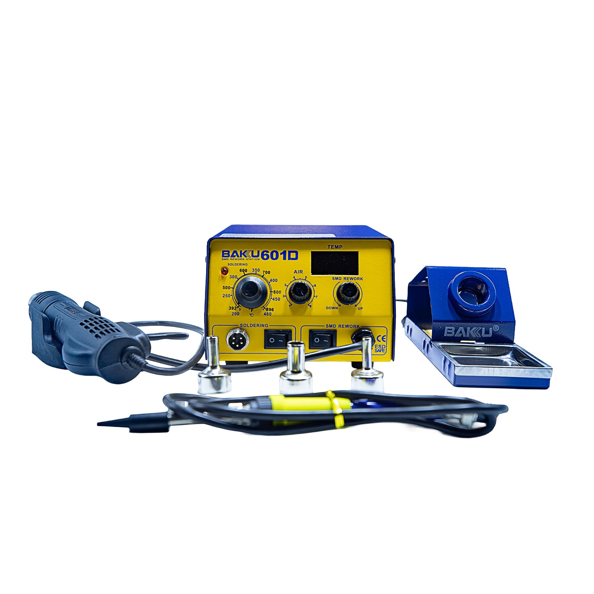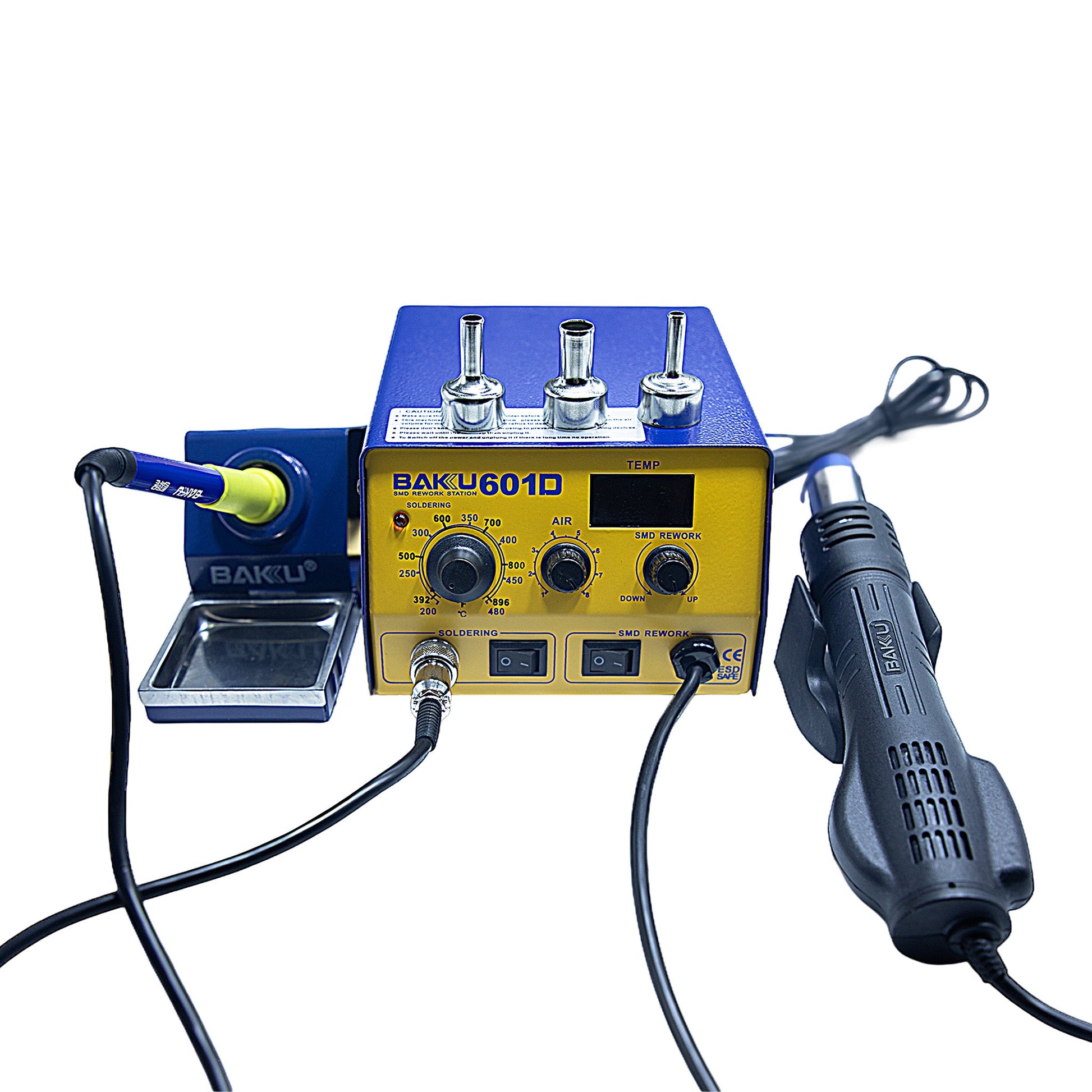 La BAKU 601D es una estación 2 en 1 que combina cautín y aire caliente, ideal para técnicos que buscan un equipo compacto, eficiente y multifuncional. Diseñada para trabajos de soldadura, desoldado y retrabajo de componentes electrónicos, esta estación ofrece control independiente de temperatura y flujo de aire, brindando precisión y seguridad en todo tipo de reparaciones.