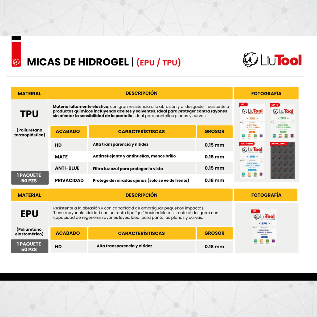 El Liutool Combo Mix de Micas de Hidrogel TPU es la solución perfecta para talleres técnicos, centros de reparación y negocios de accesorios que buscan ofrecer variedad, calidad y protección avanzada en un solo paquete. Este combo incluye 50 unidades de micas en 4 tipos diferentes, ideales para adaptarse a las necesidades de cada cliente y tipo de dispositivo.